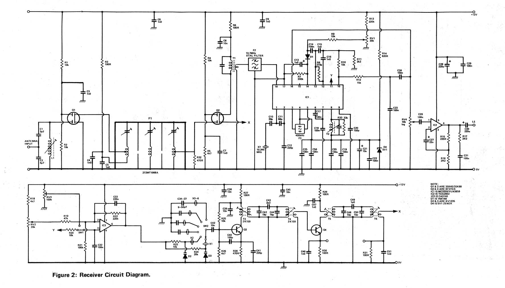 | Introduction This receiver is a six channel crystal controlled design. An AFC facility is available on two channels, since the doppler frequency shift on the 2 meter beacon is about + /-3 kHz which will cause a significant degradation to the signal if a fixed frequency receiver is used. The AFC range is just sufficient to cope with the +/- 15 kHz doppler shift found on the 70cm beacon. A suitable low noise 70cm converter was described in reference (5). The low noise figure and high gain of the 3SK88 RF and mixer stages are exploited to give the receiver a sensitivity exceeding O.15uV (-l24dBm) for 12dB SINAD. The heart of the receiver is an MC3359/ULN3859 IF IC, which is a tidied-up and slightly improved version of the MC3357. The use of this IC simplifies the design of the IF considerably, and helps achieve the overall excellent price/performance of the unit. A nine times multiplication is used in the local oscillator chain to give the required range from the VXO - which also means that a readily available crystal may be used. |