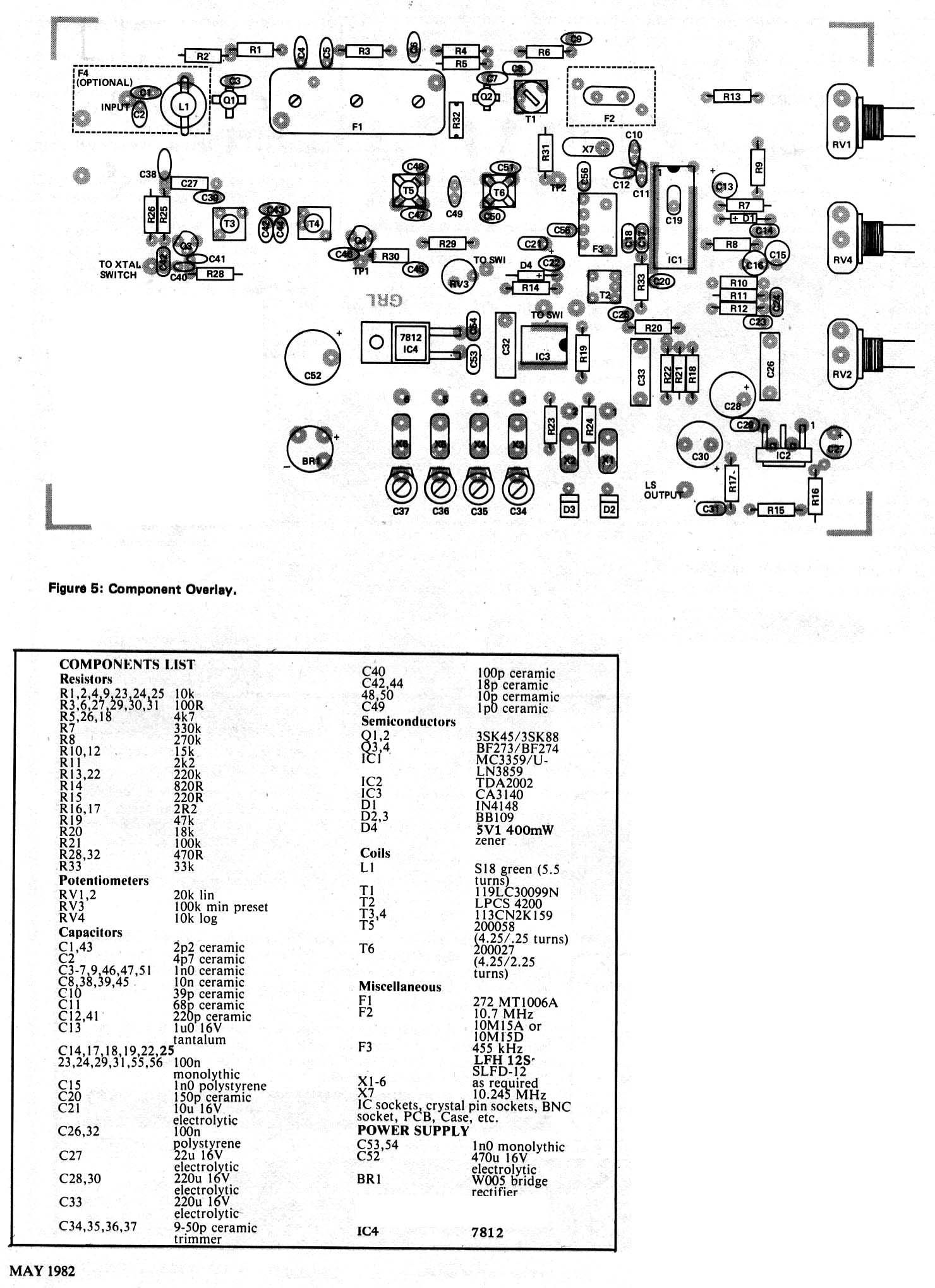 Assembly Assembly of the PCB is straightforward, but it helps if the following few notes are adhered to. All components that require an earth connection should be soldered to the top of the board. The earth leads on IC1 and 1C3's sockets are bent outwards before soldering. If an SLF-D type filter is used, its earth connectors are made likewise. Fl,T1 /3/4 connections and the earth leads of C42/44/48/50 should be soldered top and bottom. Qi source and the earth track under F2 should be connected through the PCB to the earth plane. C19 must be fitted before IC1's socket. Testing Remove IC1 & 3 from their sockets. Connect the power and check the supply voltages. Check the audio amplifier operation by applying a signal to pin I of 1C2 (finger or signal generator). Fit a crystal in channel 3, set T3 and T4 cores level with the can top, and monitor the voltage on Q4 emitter, TPI, tuning T3 and T4 for maximum reading. Monitor TP2 and tune T5/T6. Retune T3 and T4 for maximum. Switch the supply off, insert ICi and switch on again. Set the mute fully anticlockwise. Using either a signal generator or strong local signal, tune T2, TI, and Cl for best signal - to - noise ratio. If a signal generator is available, inject signal at 10.7 MHz to pin 18 of ICI and set the voltage on pin 11 to about 2.8V by tuning T2. Without a signal generator, the descriminator may be set up by tuning T2 as before, but with no signal input to the receiver. Inserting 1C3 activates the AFC to channels I and 2. RV2 provides coarse tuning for these channels. With SWI set to manual - and RV2 to centre of its travel - adjust RV3 to give about 5V at pin 6 of 1C3. This sets the manual tuning range. Although Fl is supplied fully aligned, it may require some minor adjustment to take account of circuit variations. When the receiver has been tuned as above, it is a good idea to slightly retune Ll, Fl, TI and T6 for best signal - to - noise. |